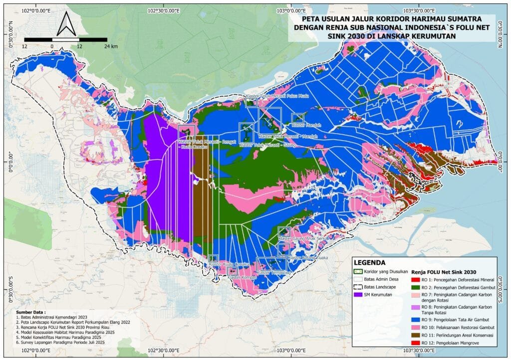”Hasil rumusan Model Koridor Harimau Sumatera menjadi langkah strategis pemulihan konektivitas habitat melalui pendekatan restorasi ekosistem. Model ini dirancang untuk menghubungkan fragmen-fragmen hutan penting melalui koridor sepanjang 34,13 kilometer dengan luas 3.445,61 hektar, yang tersebar dalam 15 klaster koridor di Lanskap Kerumutan. Koridor dirancang mengikuti bentang alam alami seperti sungai, menjauhi permukiman, serta menggunakan desain vegetasi berlapis guna mendukung pergerakan satwa dan menjaga ketersediaan mangsa” ujarnya.
